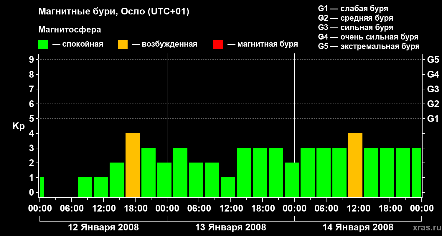 Изменения геомагнитного индекса Kp с 12 по 14 января 2008 года для средних широт