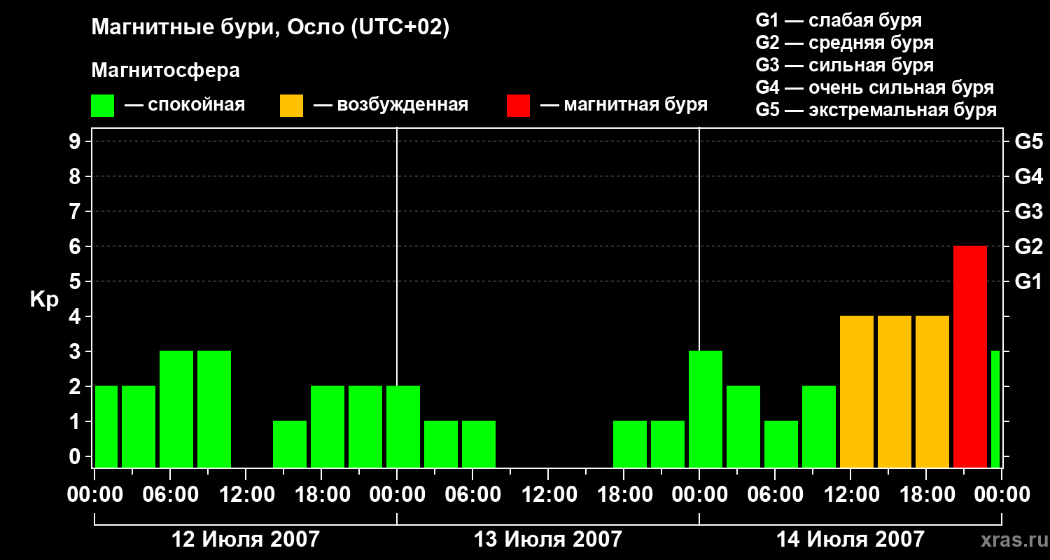 Изменения геомагнитного индекса Kp с 12 по 14 июля 2007 года для средних широт