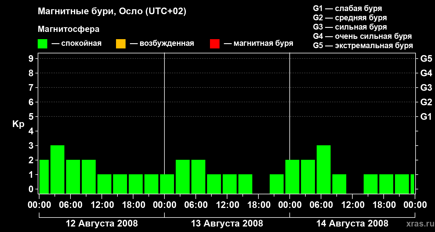 Изменения геомагнитного индекса Kp с 12 по 14 августа 2008 года для средних широт