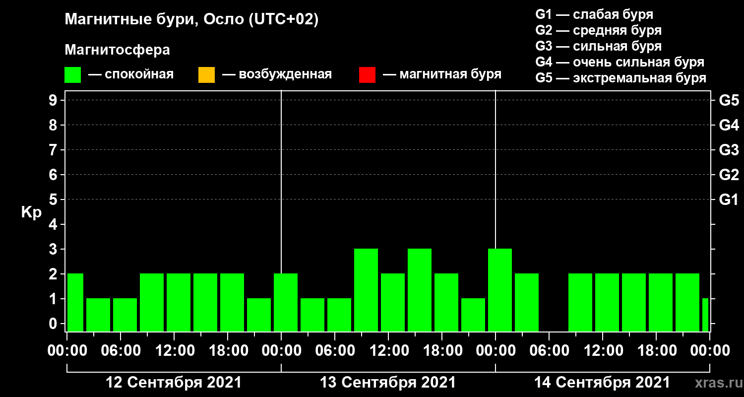 Изменения геомагнитного индекса Kp с 12 по 14 сентября 2021 года для средних широт