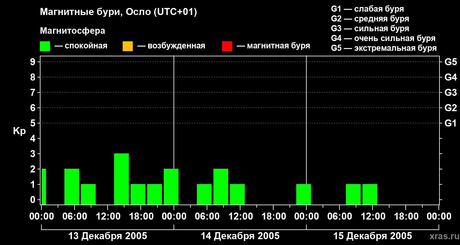 Изменения геомагнитного индекса Kp с 13 по 15 декабря 2005 года для средних широт