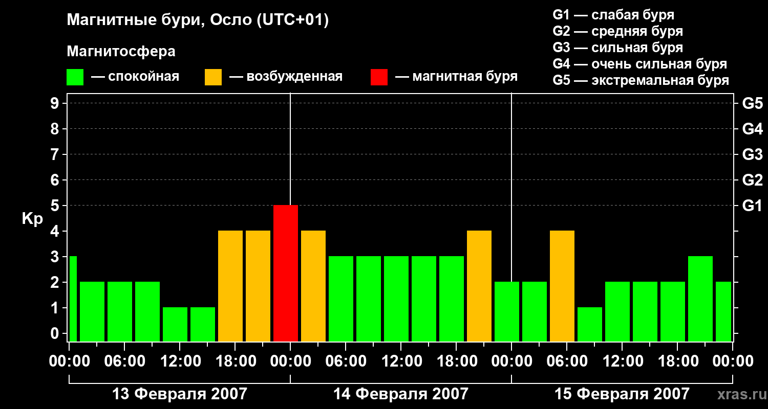 Изменения геомагнитного индекса Kp с 13 по 15 февраля 2007 года для средних широт