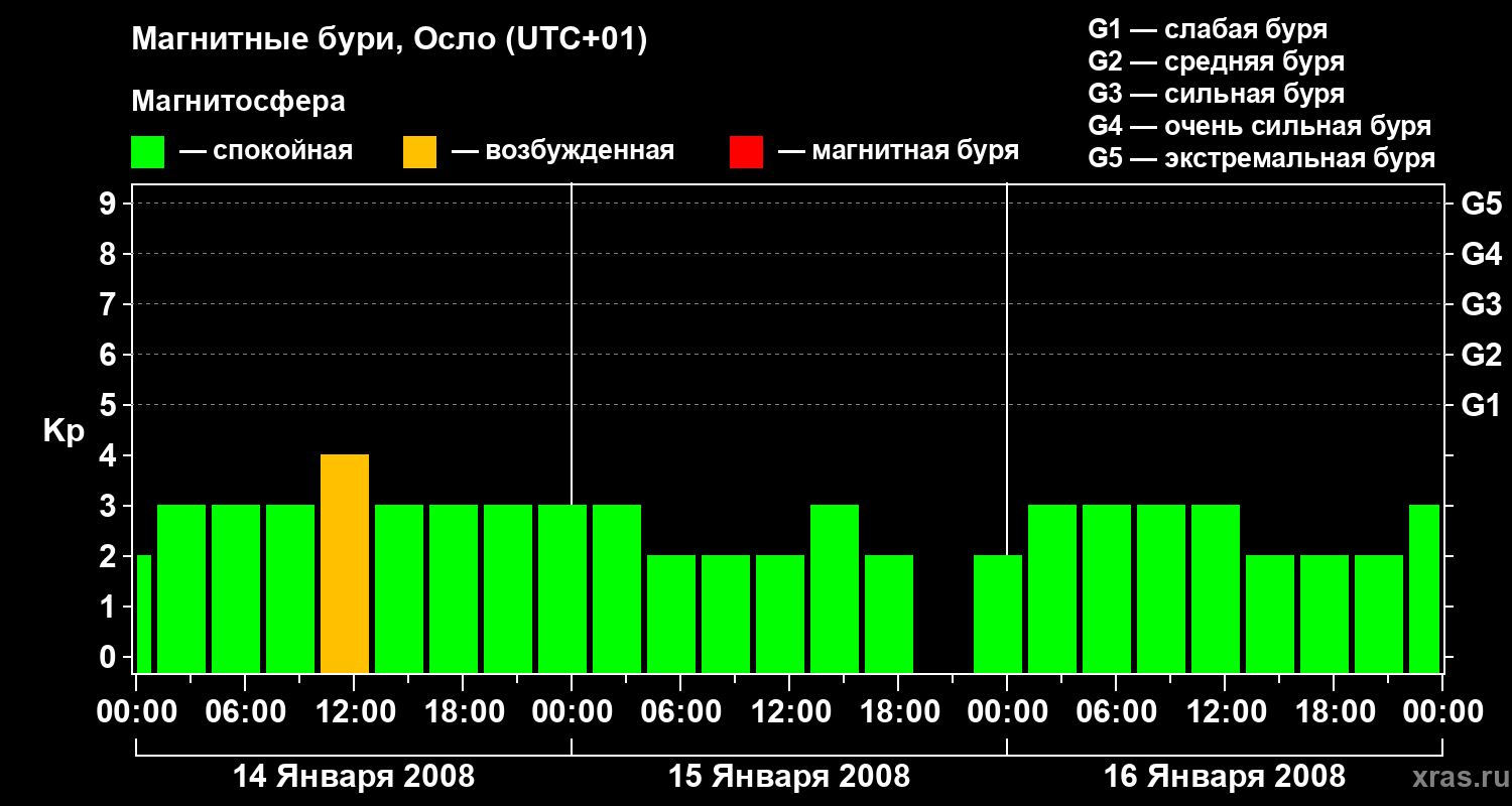 Изменения геомагнитного индекса Kp с 14 по 16 января 2008 года для средних широт