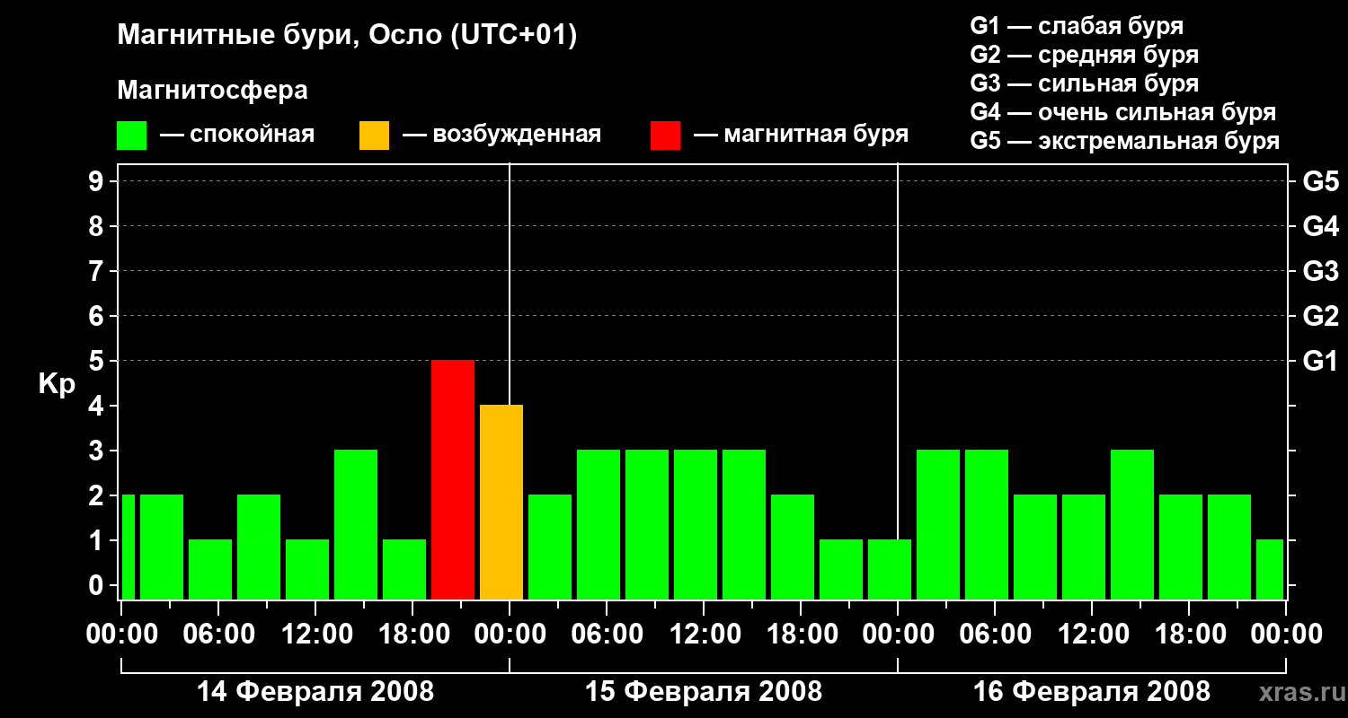 Изменения геомагнитного индекса Kp с 14 по 16 февраля 2008 года для средних широт
