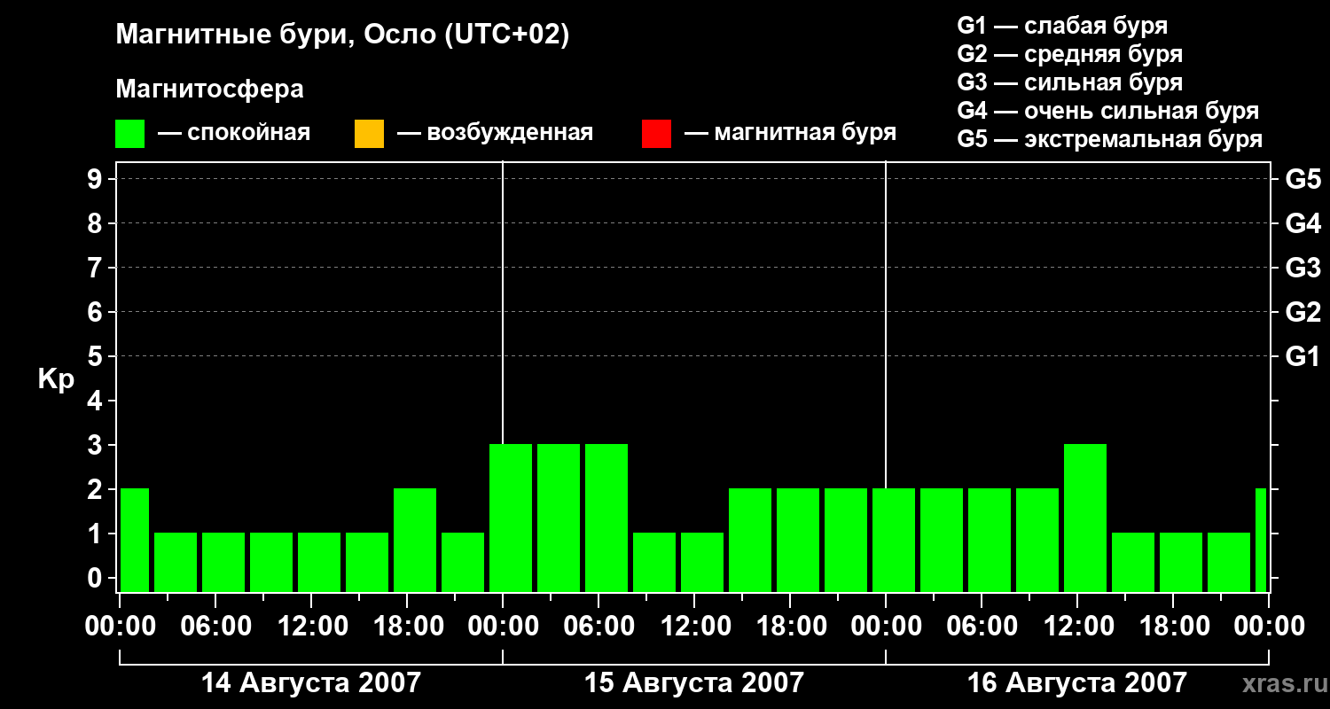Изменения геомагнитного индекса Kp с 14 по 16 августа 2007 года для средних широт