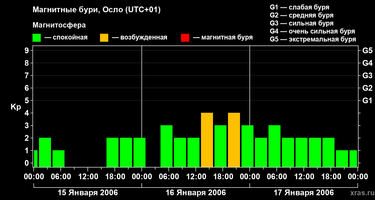 Изменения геомагнитного индекса Kp с 15 по 17 января 2006 года для средних широт