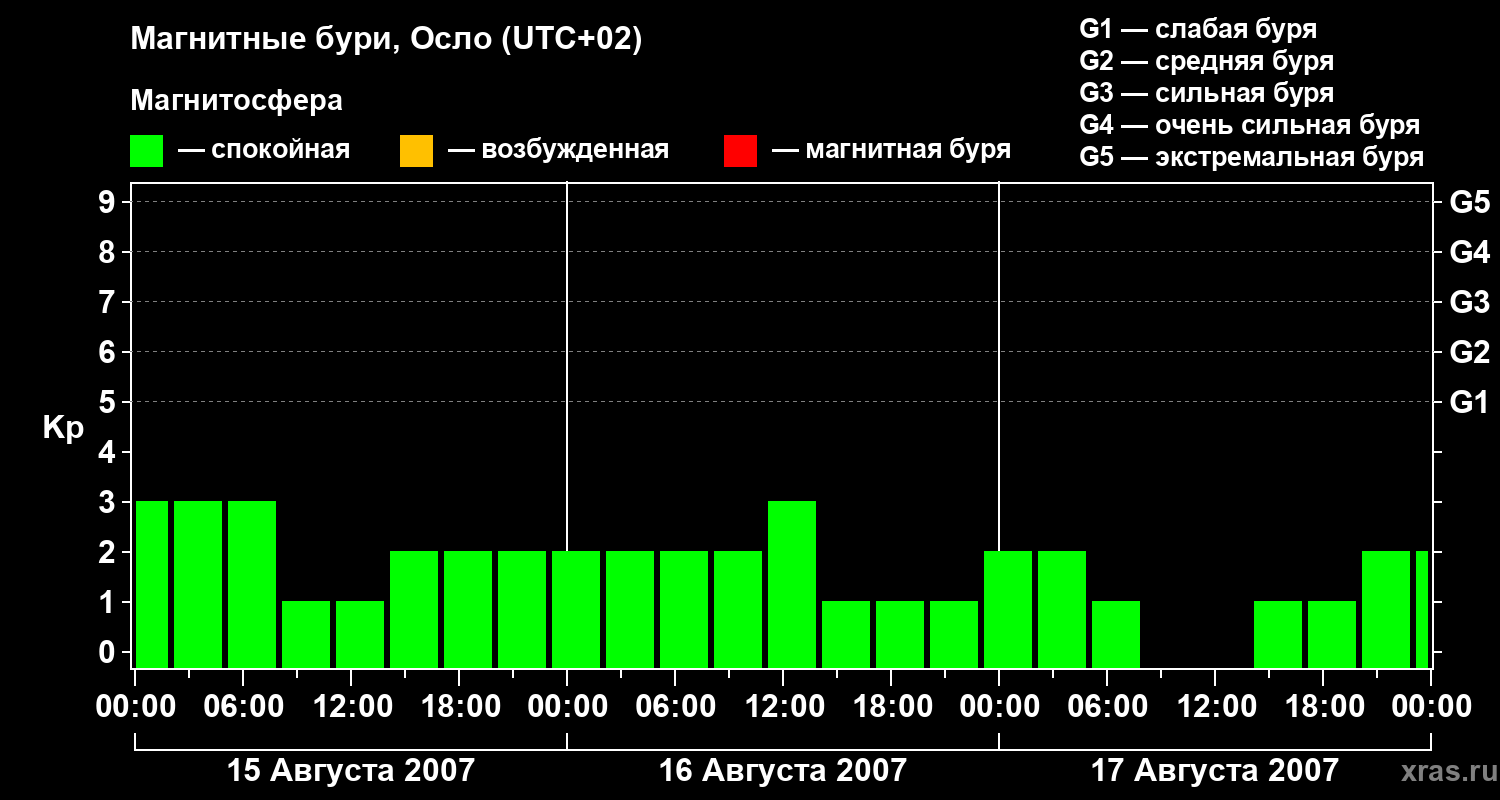 Изменения геомагнитного индекса Kp с 15 по 17 августа 2007 года для средних широт