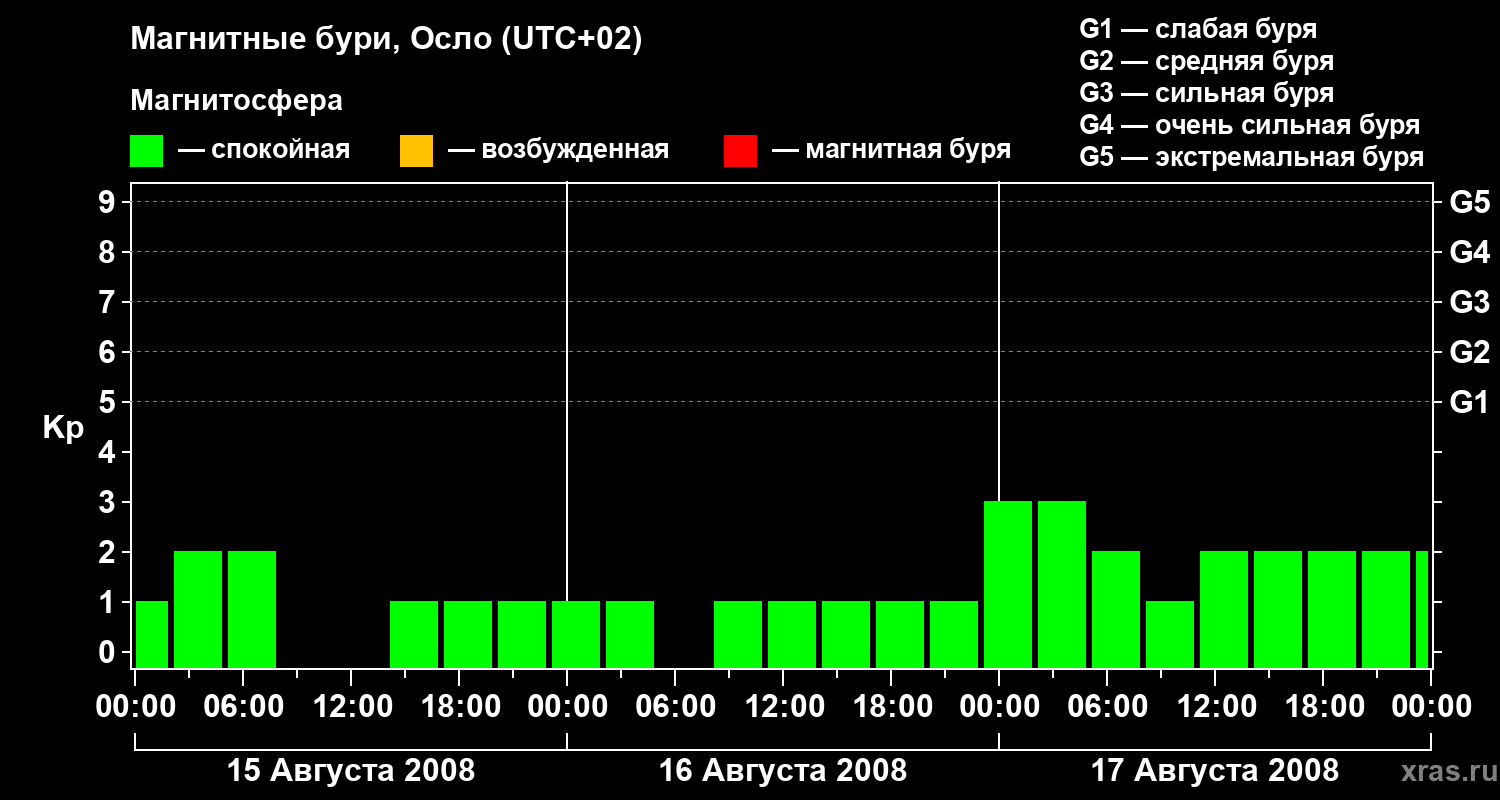 Изменения геомагнитного индекса Kp с 15 по 17 августа 2008 года для средних широт