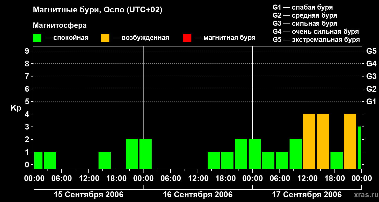 Изменения геомагнитного индекса Kp с 15 по 17 сентября 2006 года для средних широт