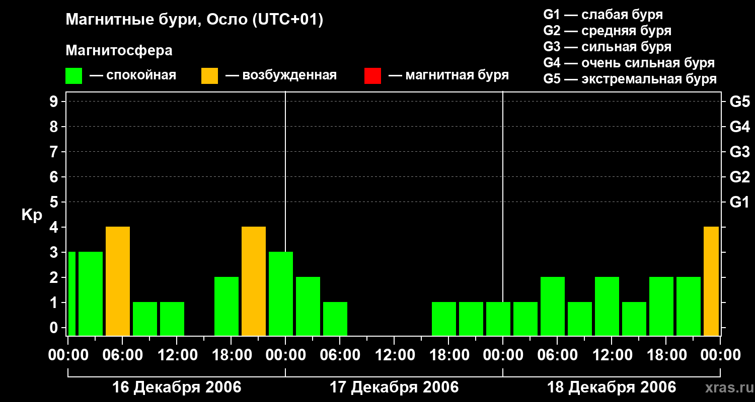 Изменения геомагнитного индекса Kp с 16 по 18 декабря 2006 года для средних широт