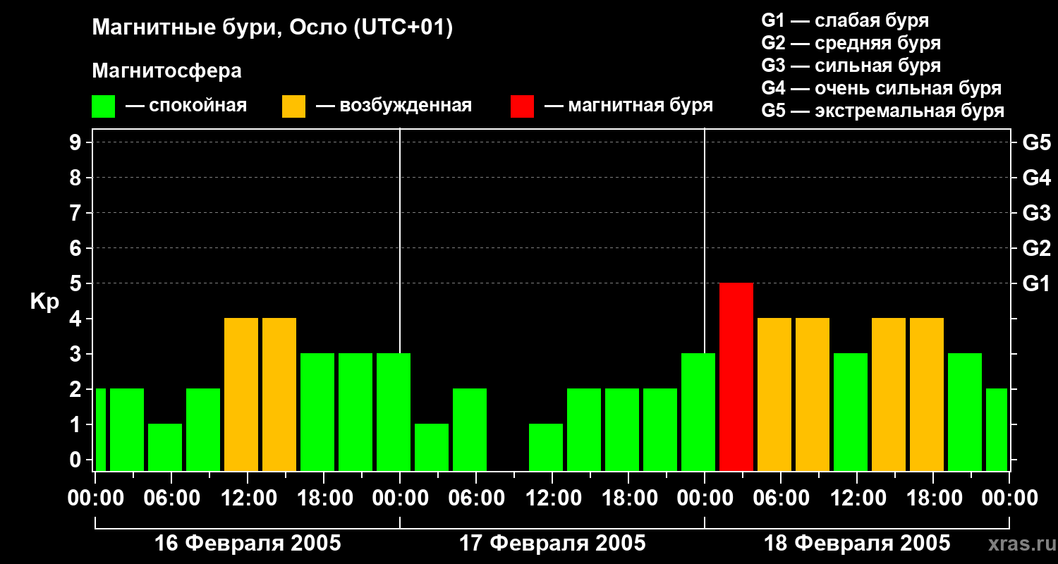 Изменения геомагнитного индекса Kp с 16 по 18 февраля 2005 года для средних широт