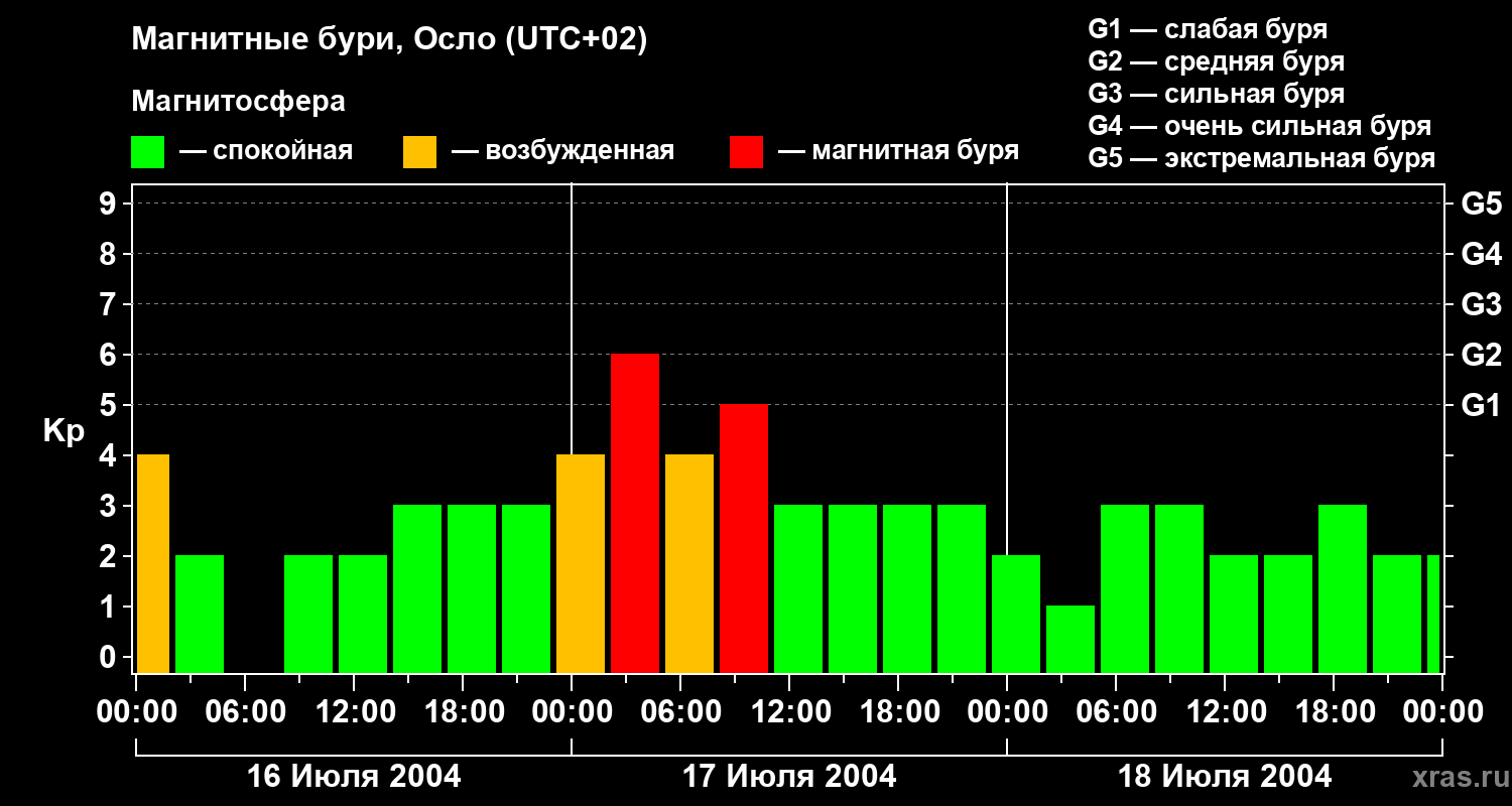 Изменения геомагнитного индекса Kp с 16 по 18 июля 2004 года для средних широт