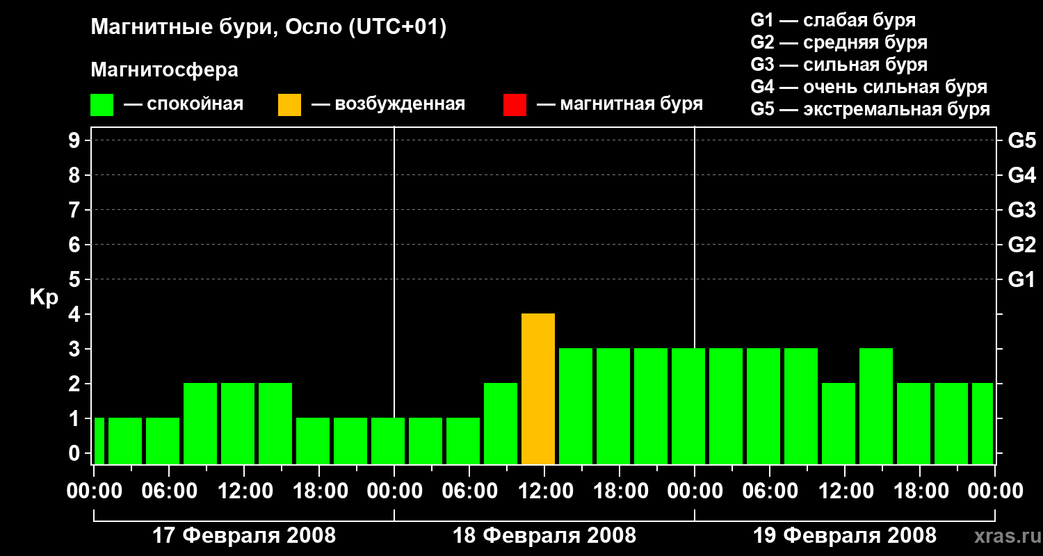 Изменения геомагнитного индекса Kp с 17 по 19 февраля 2008 года для средних широт