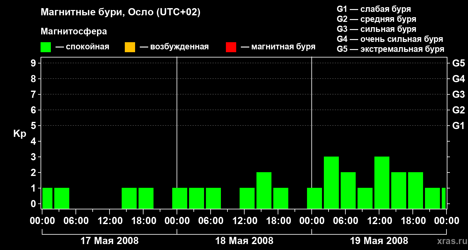 Изменения геомагнитного индекса Kp с 17 по 19 мая 2008 года для средних широт