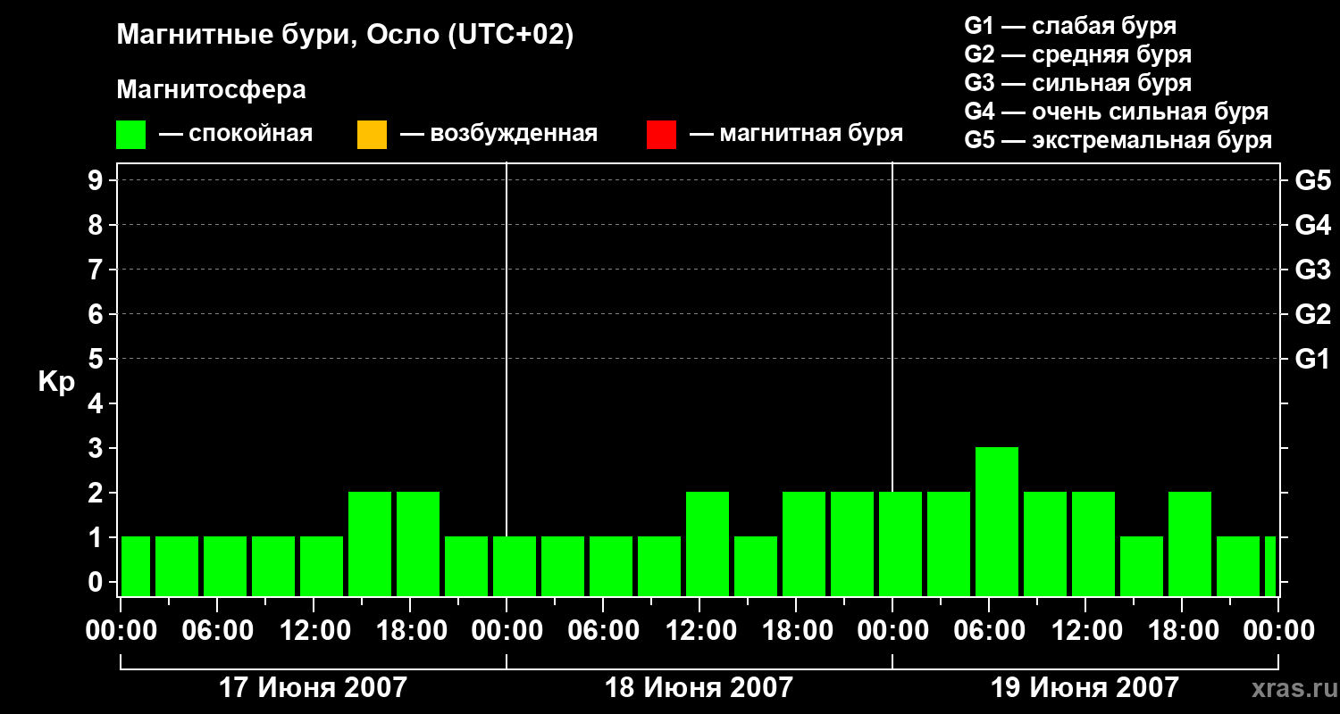 Изменения геомагнитного индекса Kp с 17 по 19 июня 2007 года для средних широт