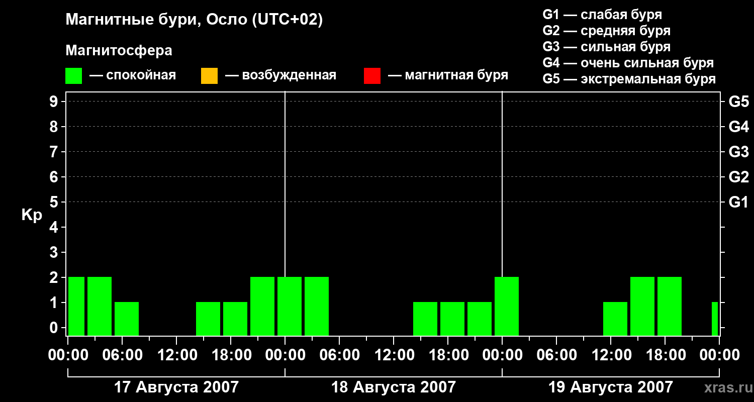 Изменения геомагнитного индекса Kp с 17 по 19 августа 2007 года для средних широт