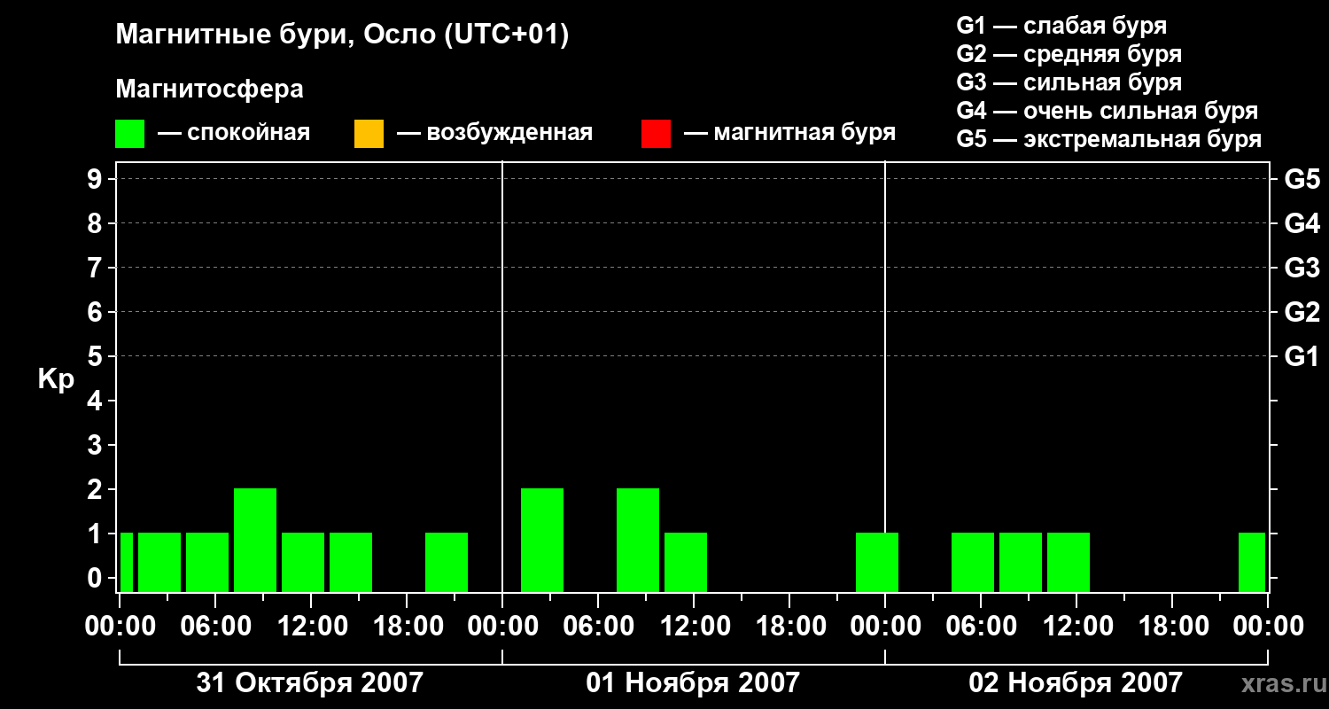 Изменения геомагнитного индекса Kp с 31 октября по 2 ноября 2007 года для средних широт