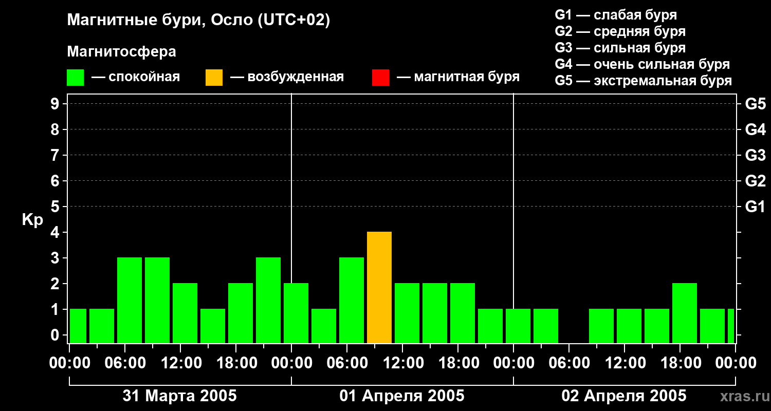 Изменения геомагнитного индекса Kp с 31 марта по 2 апреля 2005 года для средних широт