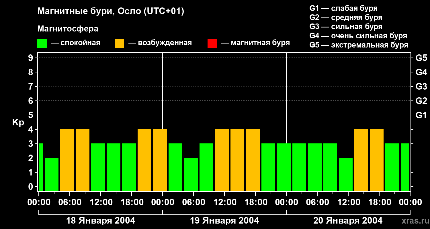 Изменения геомагнитного индекса Kp с 18 по 20 января 2004 года для средних широт