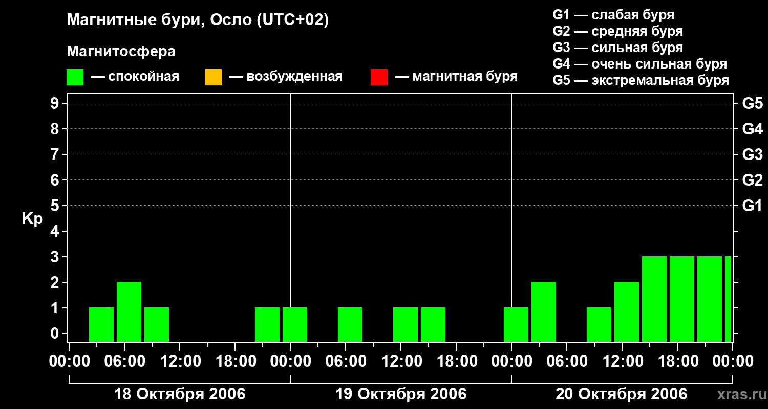 Изменения геомагнитного индекса Kp с 18 по 20 октября 2006 года для средних широт