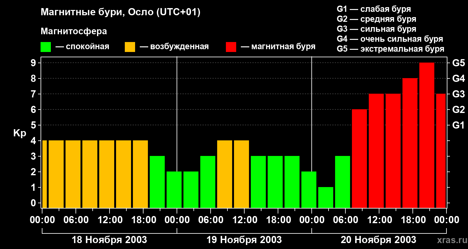 Изменения геомагнитного индекса Kp с 18 по 20 ноября 2003 года для средних широт