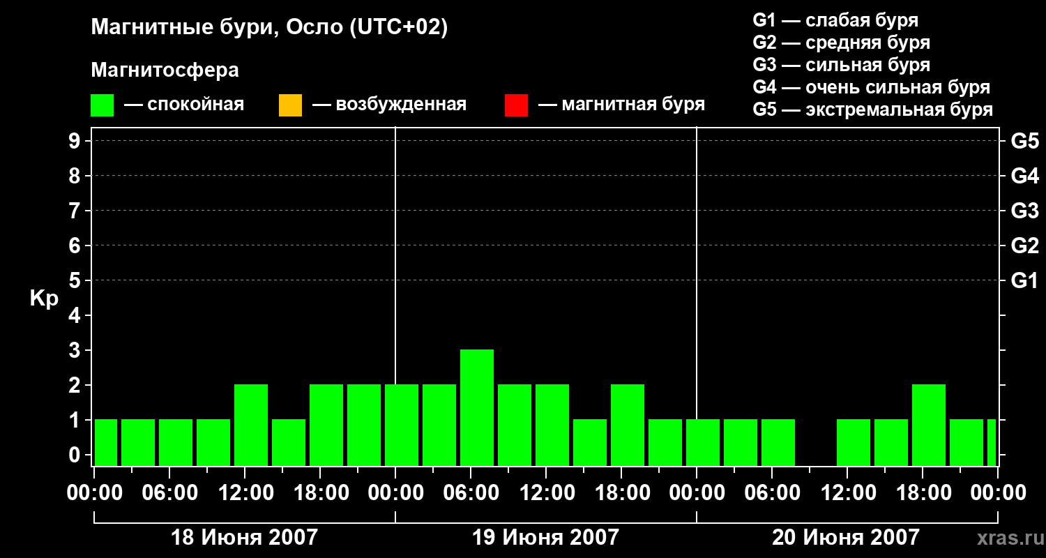 Изменения геомагнитного индекса Kp с 18 по 20 июня 2007 года для средних широт