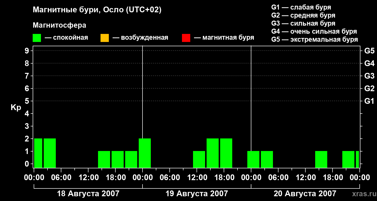 Изменения геомагнитного индекса Kp с 18 по 20 августа 2007 года для средних широт