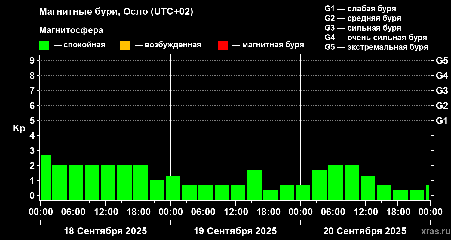 Изменения геомагнитного индекса Kp с 18 по 20 сентября 2025 года для средних широт