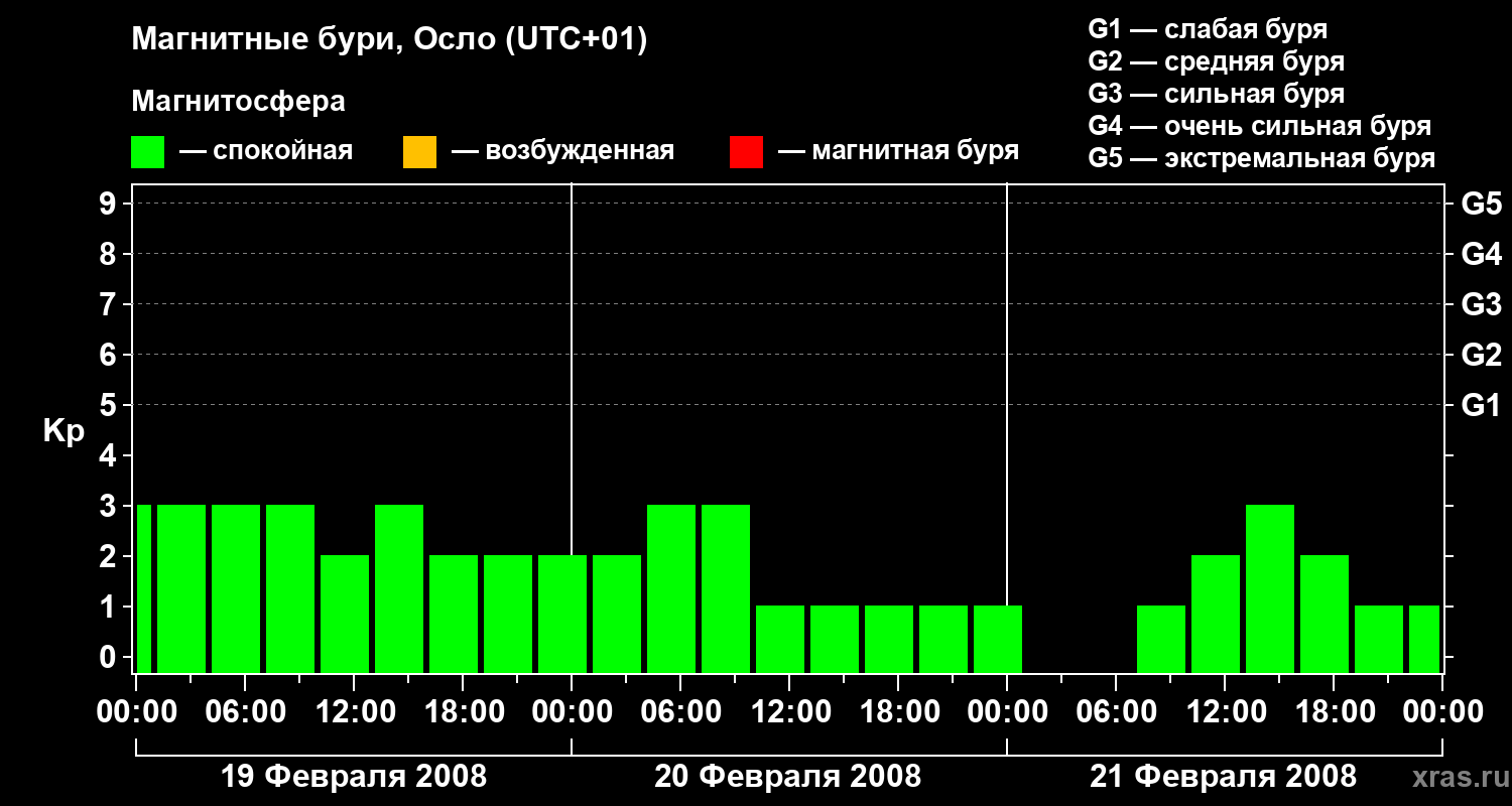 Изменения геомагнитного индекса Kp с 19 по 21 февраля 2008 года для средних широт