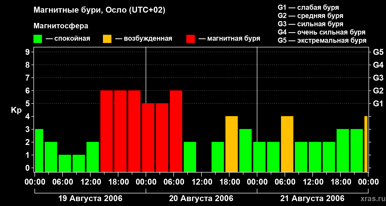 Изменения геомагнитного индекса Kp с 19 по 21 августа 2006 года для средних широт
