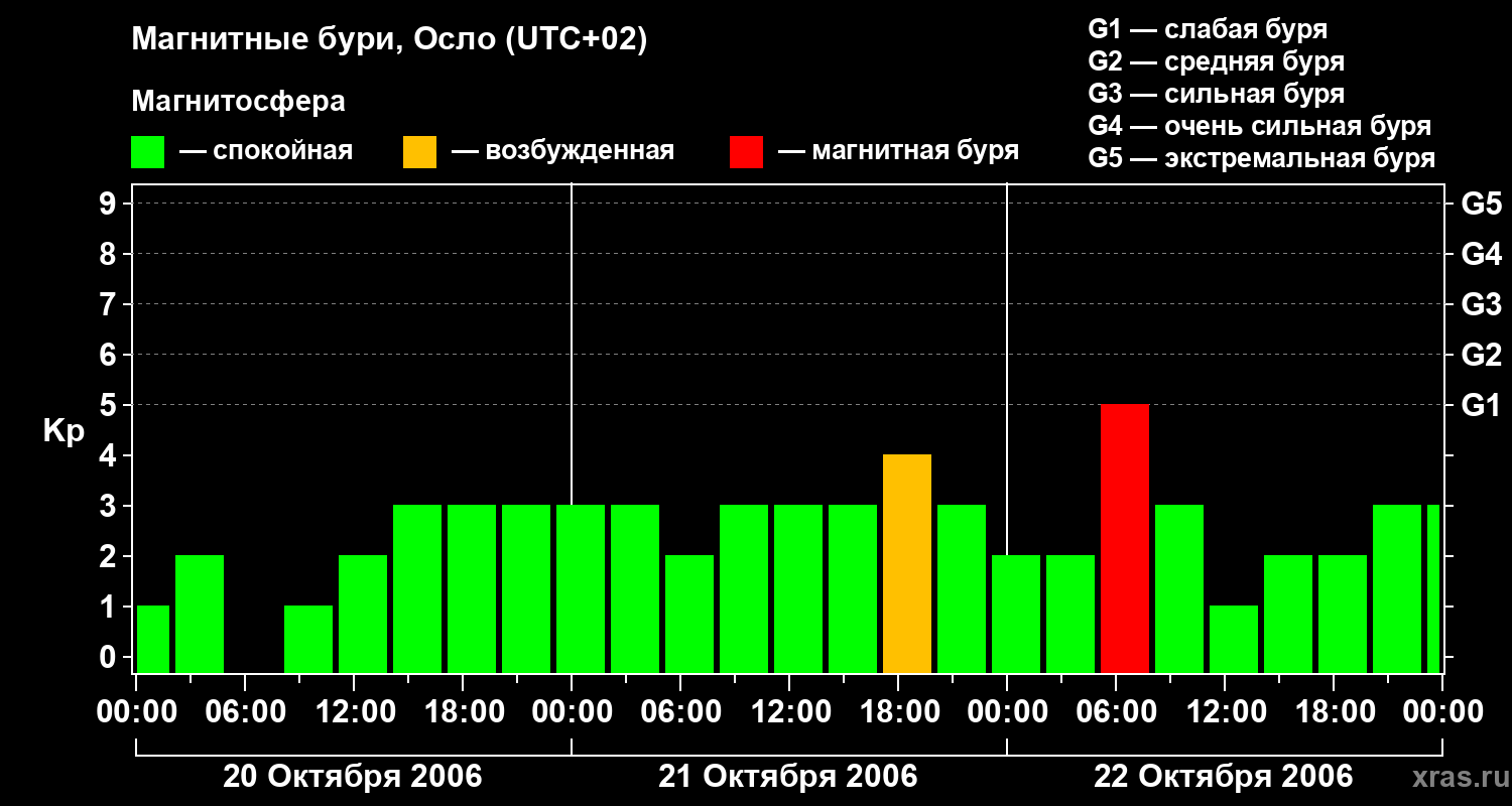 Изменения геомагнитного индекса Kp с 20 по 22 октября 2006 года для средних широт