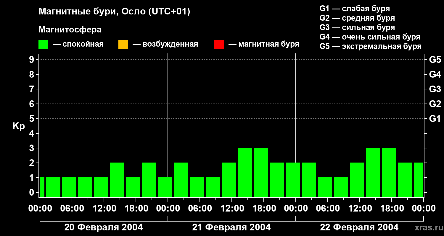 Изменения геомагнитного индекса Kp с 20 по 22 февраля 2004 года для средних широт