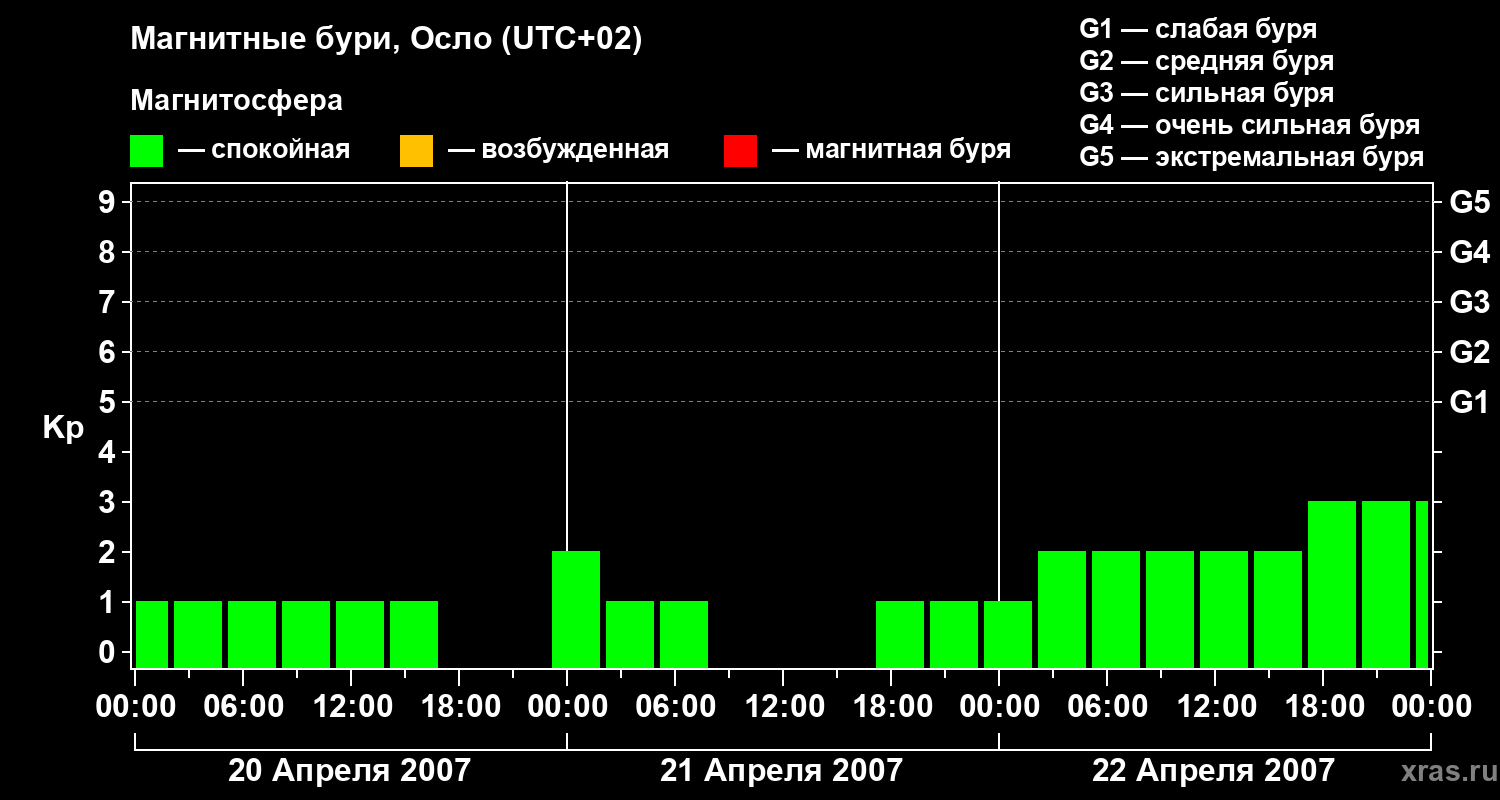 Изменения геомагнитного индекса Kp с 20 по 22 апреля 2007 года для средних широт