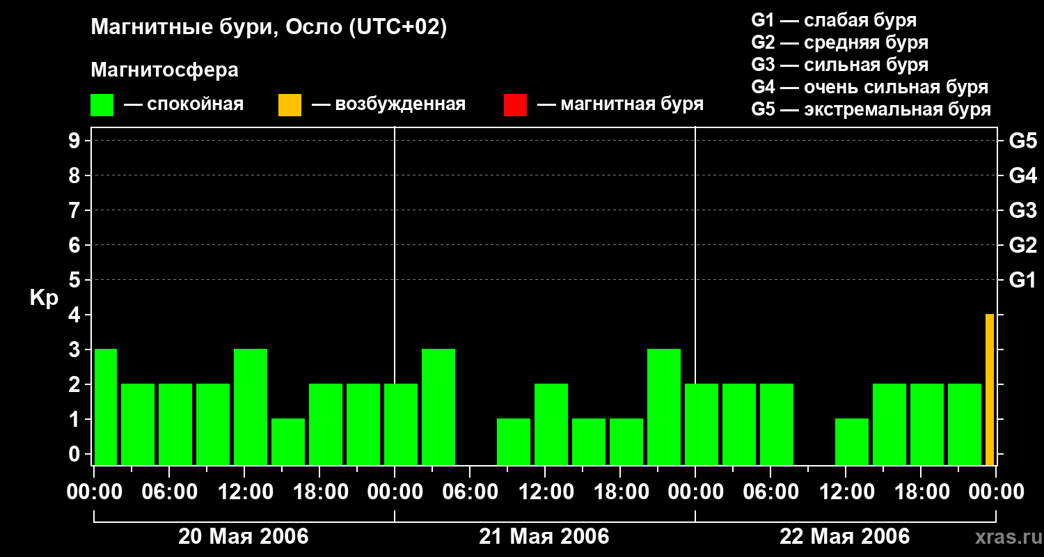 Изменения геомагнитного индекса Kp с 20 по 22 мая 2006 года для средних широт