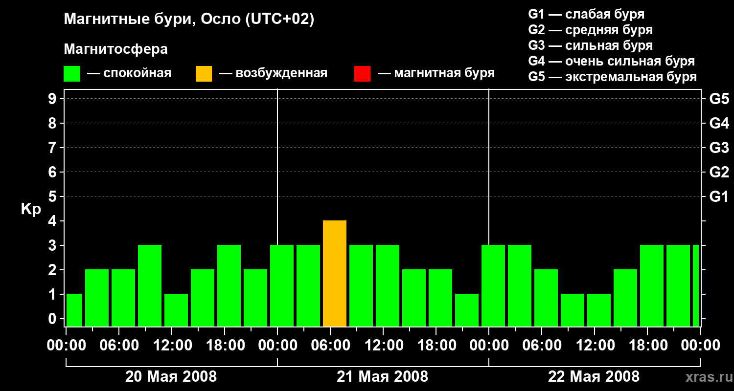 Изменения геомагнитного индекса Kp с 20 по 22 мая 2008 года для средних широт