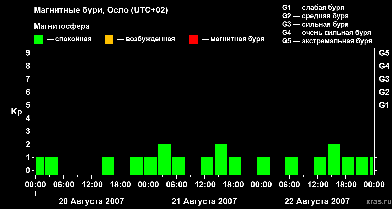 Изменения геомагнитного индекса Kp с 20 по 22 августа 2007 года для средних широт