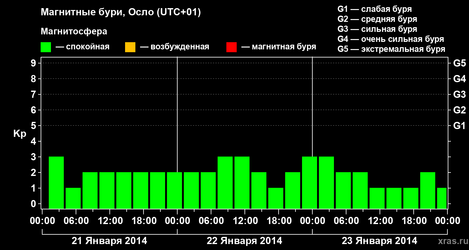 Изменения геомагнитного индекса Kp с 21 по 23 января 2014 года для средних широт