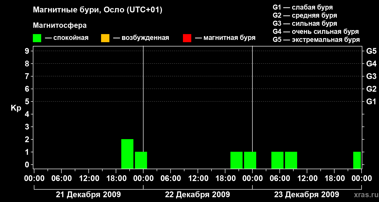 Изменения геомагнитного индекса Kp с 21 по 23 декабря 2009 года для средних широт