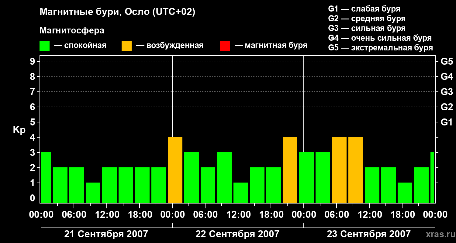 Изменения геомагнитного индекса Kp с 21 по 23 сентября 2007 года для средних широт