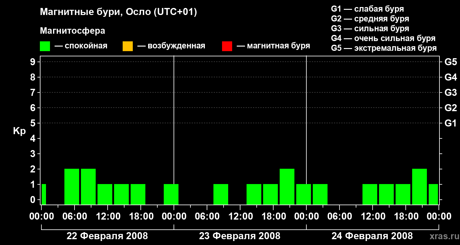Изменения геомагнитного индекса Kp с 22 по 24 февраля 2008 года для средних широт
