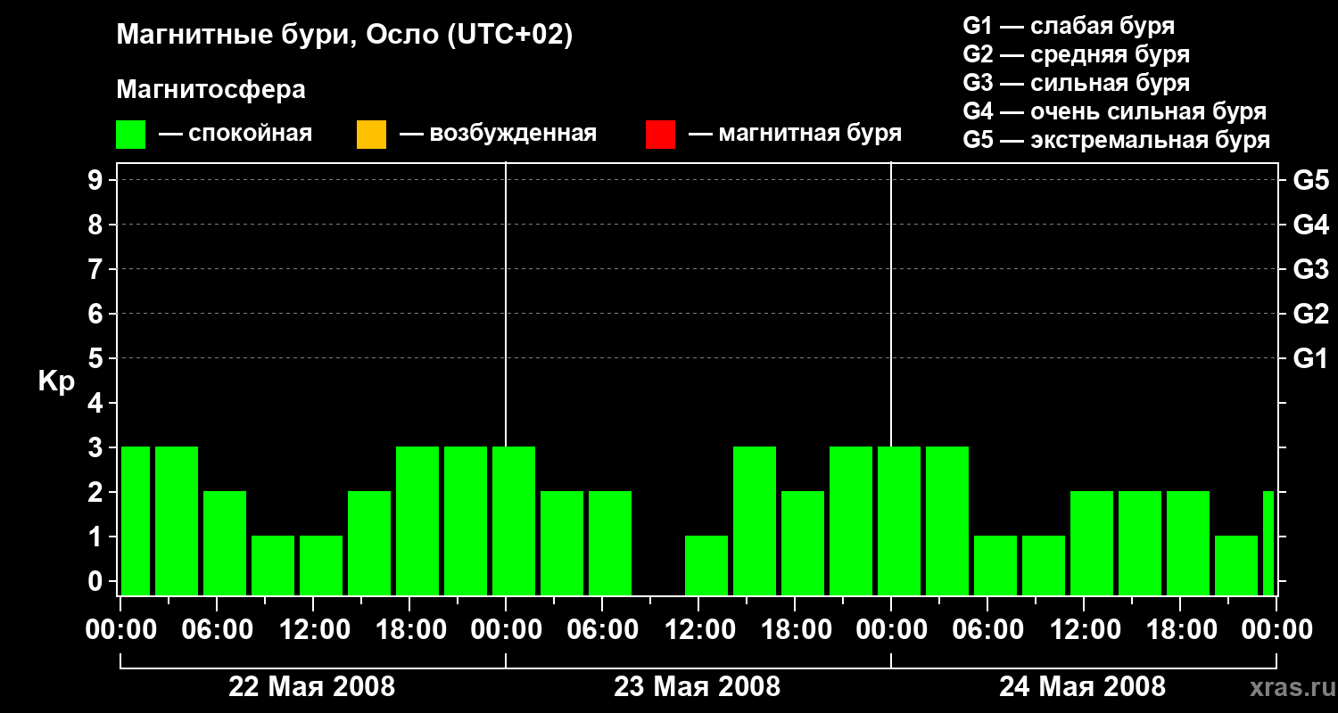 Изменения геомагнитного индекса Kp с 22 по 24 мая 2008 года для средних широт