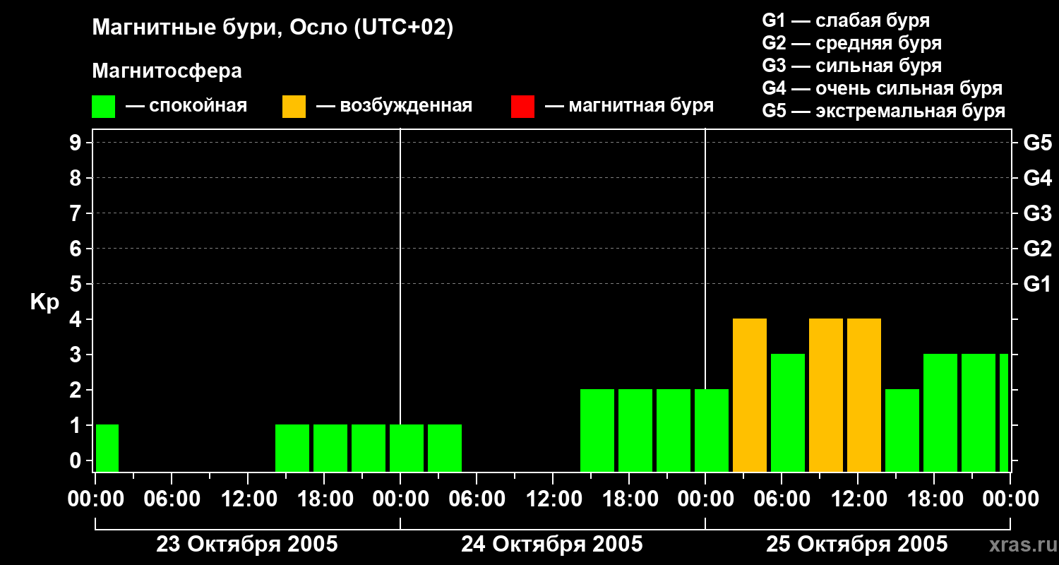 Изменения геомагнитного индекса Kp с 23 по 25 октября 2005 года для средних широт