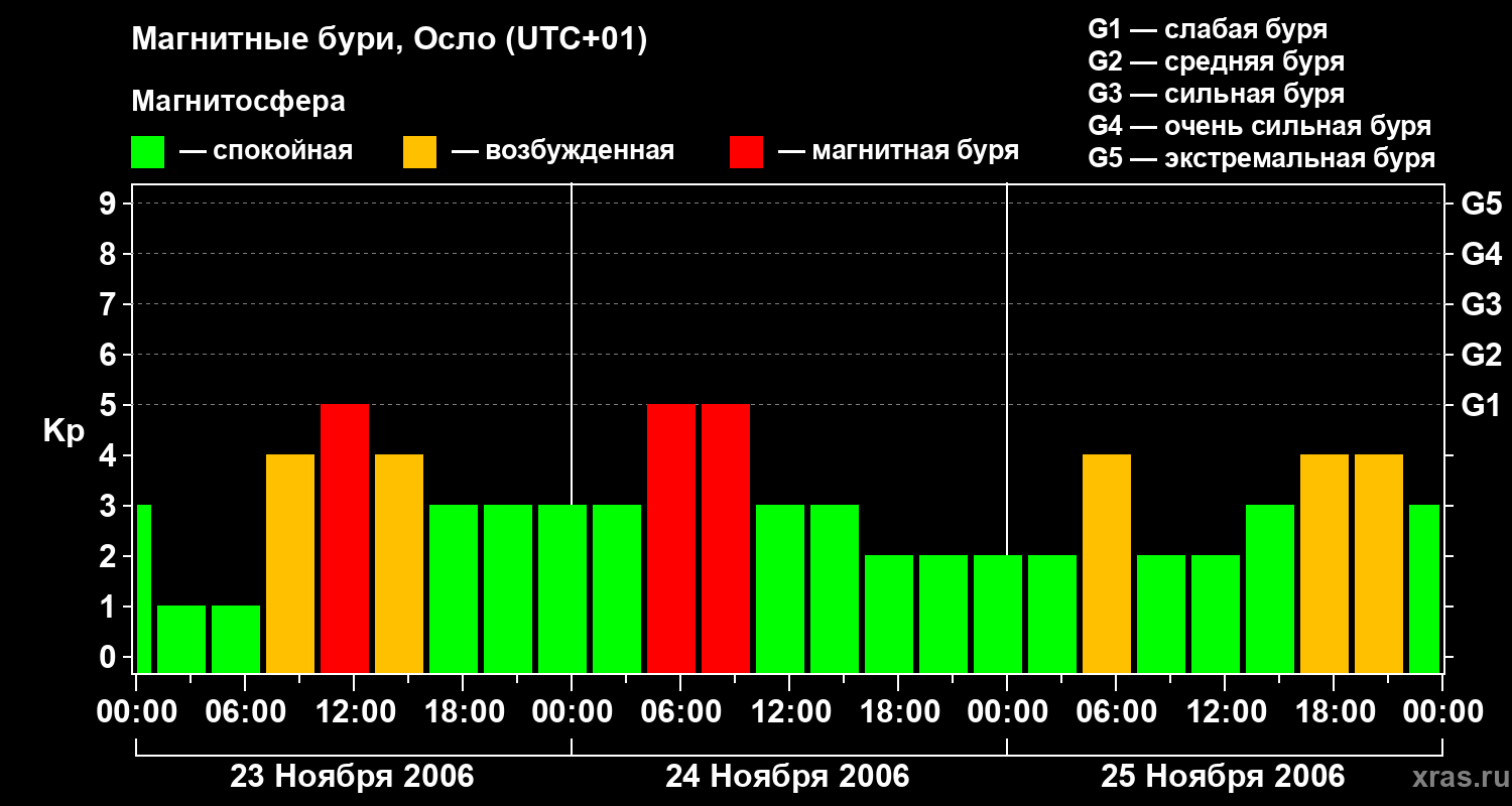 Изменения геомагнитного индекса Kp с 23 по 25 ноября 2006 года для средних широт
