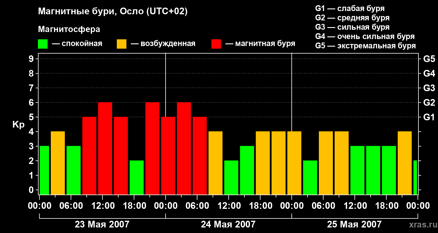Изменения геомагнитного индекса Kp с 23 по 25 мая 2007 года для средних широт