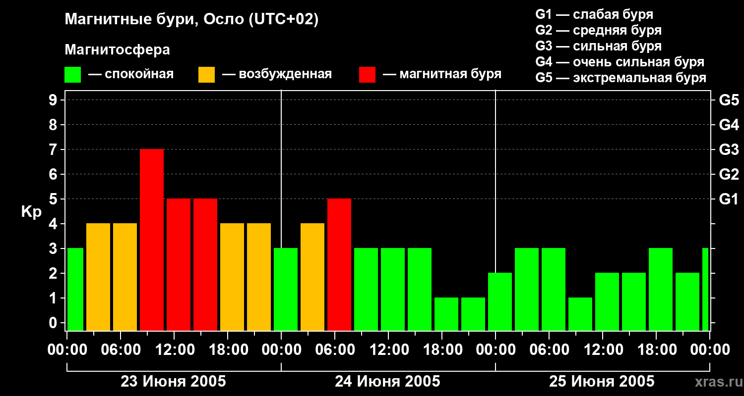 Изменения геомагнитного индекса Kp с 23 по 25 июня 2005 года для средних широт