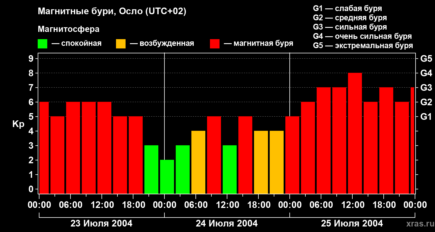 Изменения геомагнитного индекса Kp с 23 по 25 июля 2004 года для средних широт