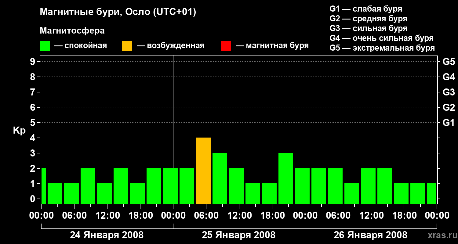 Изменения геомагнитного индекса Kp с 24 по 26 января 2008 года для средних широт