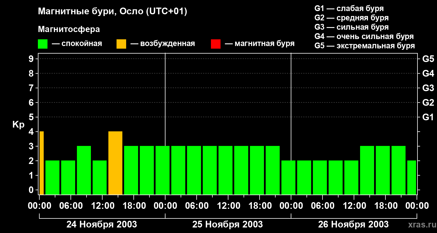 Изменения геомагнитного индекса Kp с 24 по 26 ноября 2003 года для средних широт