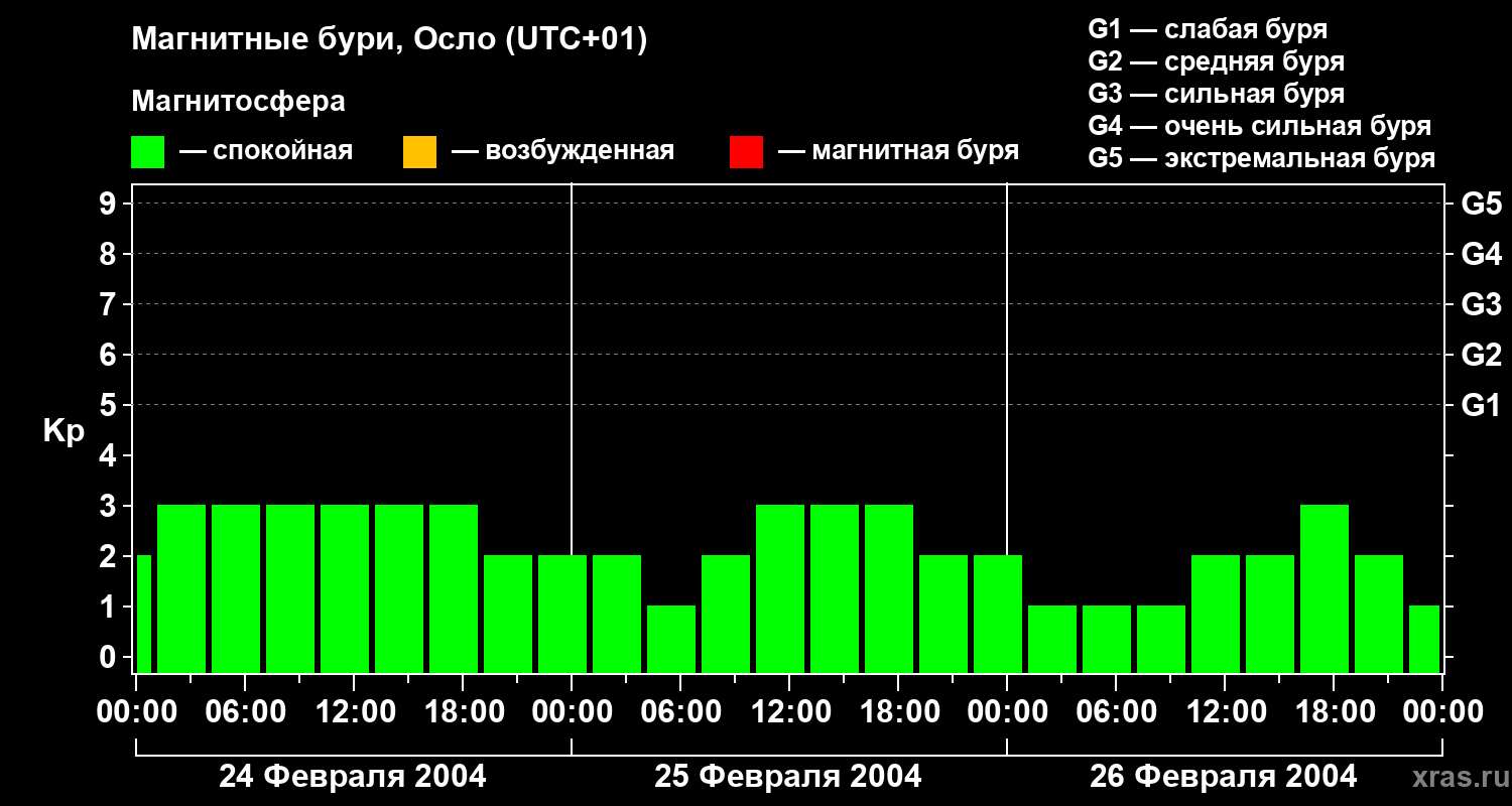 Изменения геомагнитного индекса Kp с 24 по 26 февраля 2004 года для средних широт
