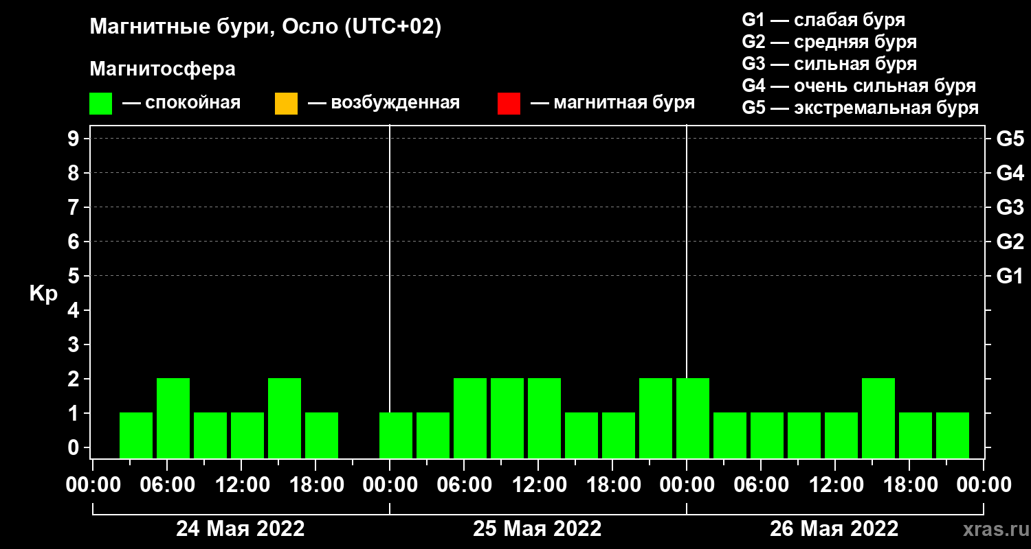 Изменения геомагнитного индекса Kp с 24 по 26 мая 2022 года для средних широт